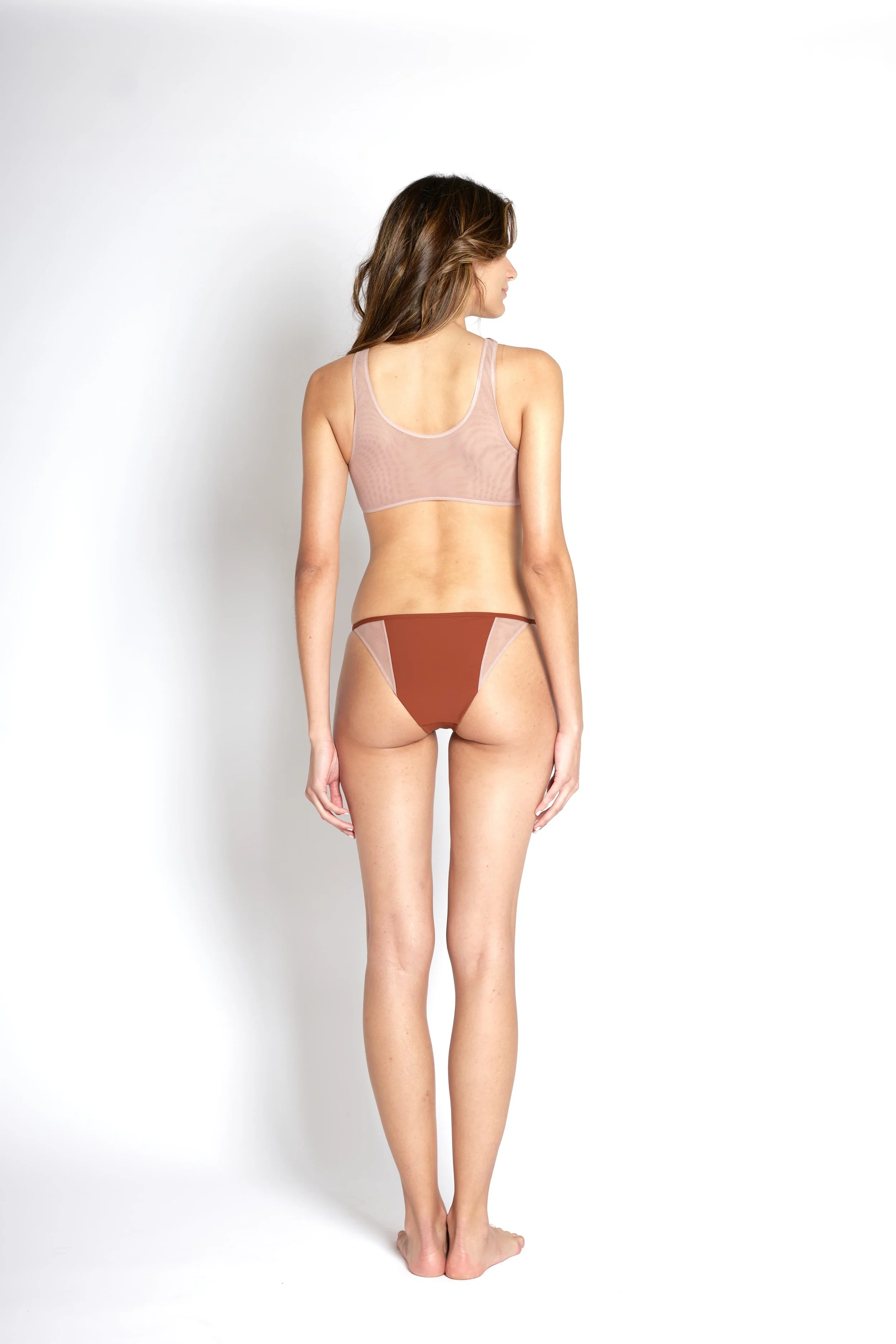 This baby is a high-necked athletic-inspired top with a low-noise construction and a pleasing rounded seam placement. Full tulle lining and a close second skin fit provide support. Soft sheer tulle on the reverse for added breathability. Perfect for those beach-filled summer days, as well as as a sport top or when paired with high-rise pants.